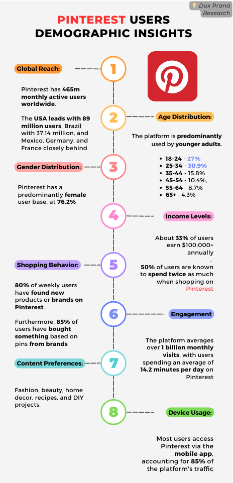 Demographics: Pinterest has 465 million monthly active users, with 76.2% female and 17.2% male. The majority of users are aged 18-34, making it ideal for targeting younger, affluent consumers (AI CustCare) .